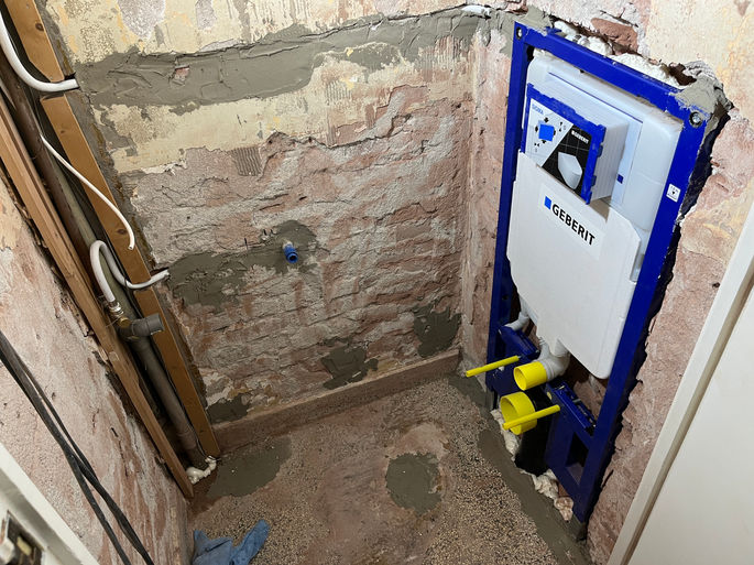 Het toilet van deze klant heeft een beperkte afmeting en ook diagonaal was het niet comfortabel zitten. Om ruimte te winnen is het inbouwreservoir in de muur verwerkt. Hierdoor is er ca 10 cm ruimte bespaard. Ook is de koker met leidingen gehalveerd om extra ruimte te creëren. Na het verwijderen van het oude toilet en fonteintje zijn de oude tegels verwijderd. Het leiding werk is allemaal aangepast en vervangen en netjes in de muur weggewerkt. Het reservoir is vervolgens in de muur verwerkt en de muren die nogal broos waren zijn geëgaliseerd voor een vlakke ondergrond voor de nieuwe tegels. Het plafond is vervangen met een inbouwspot. Na het tegelen zijn de randen en hoeken afgekit, is het toilet bevestigd en het fonteintje opgehangen.