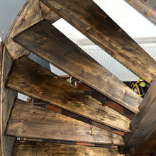 De beits op deze trap was aan vervanging toe. De gehele trap is van boven en onder geschuurd tot op het blanke hout. Daarna is de trap behandeld met olie. De eerste laag voor de kleur en de tweede laag voor antislip en bescherming. Hierbij zijn de treden om en om behandeld, zodat de bewoners nog wel de gebruiken konden.